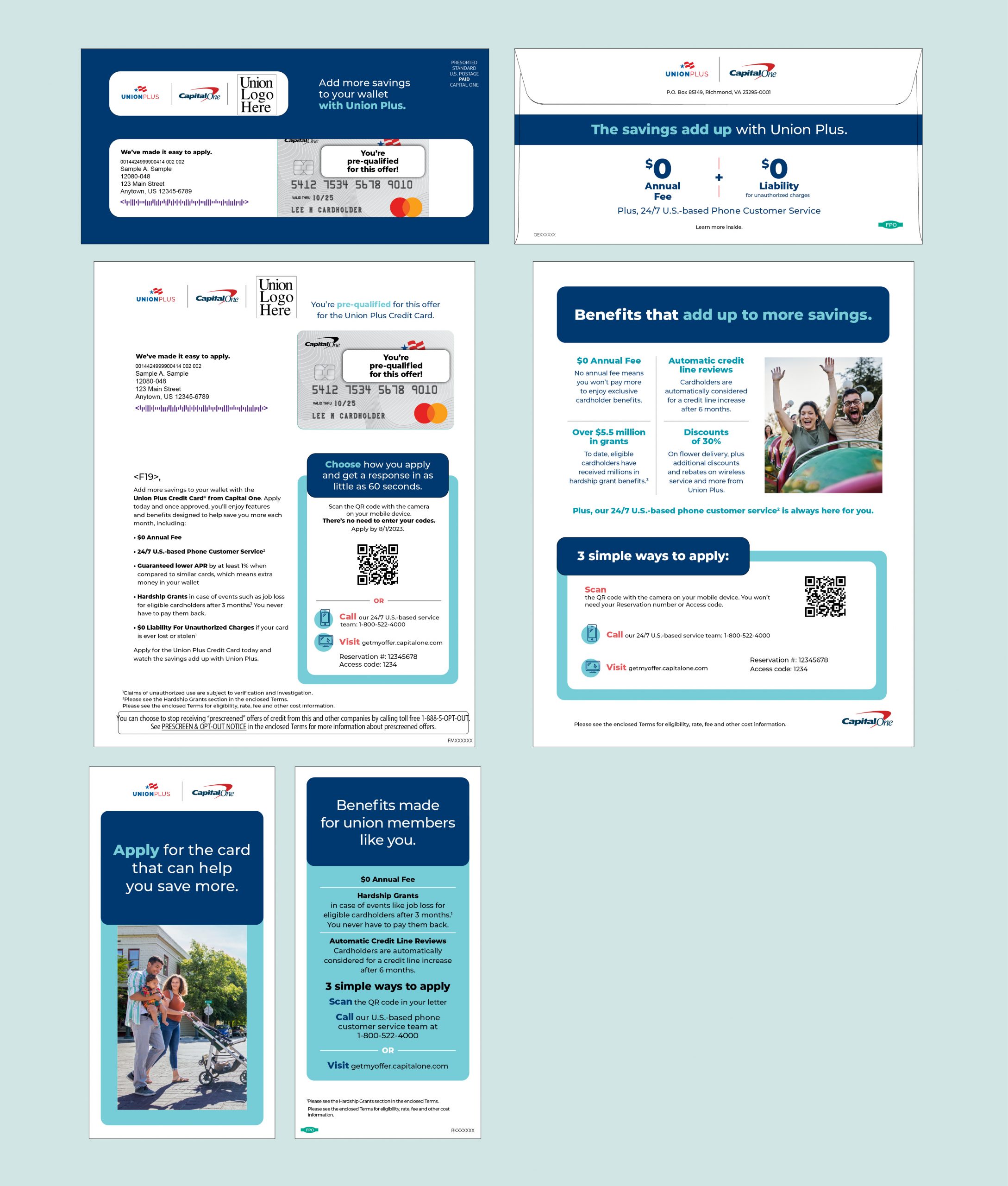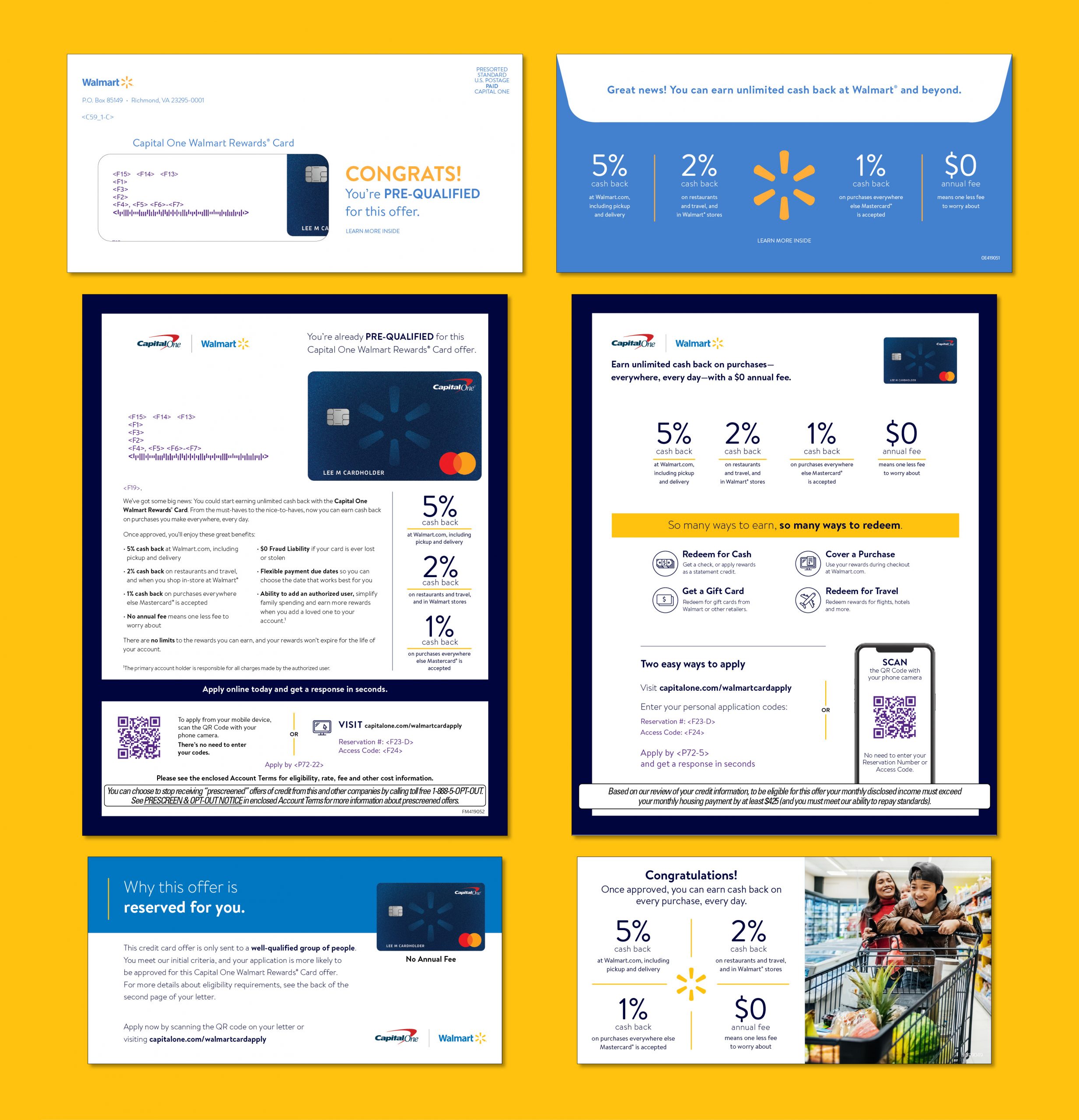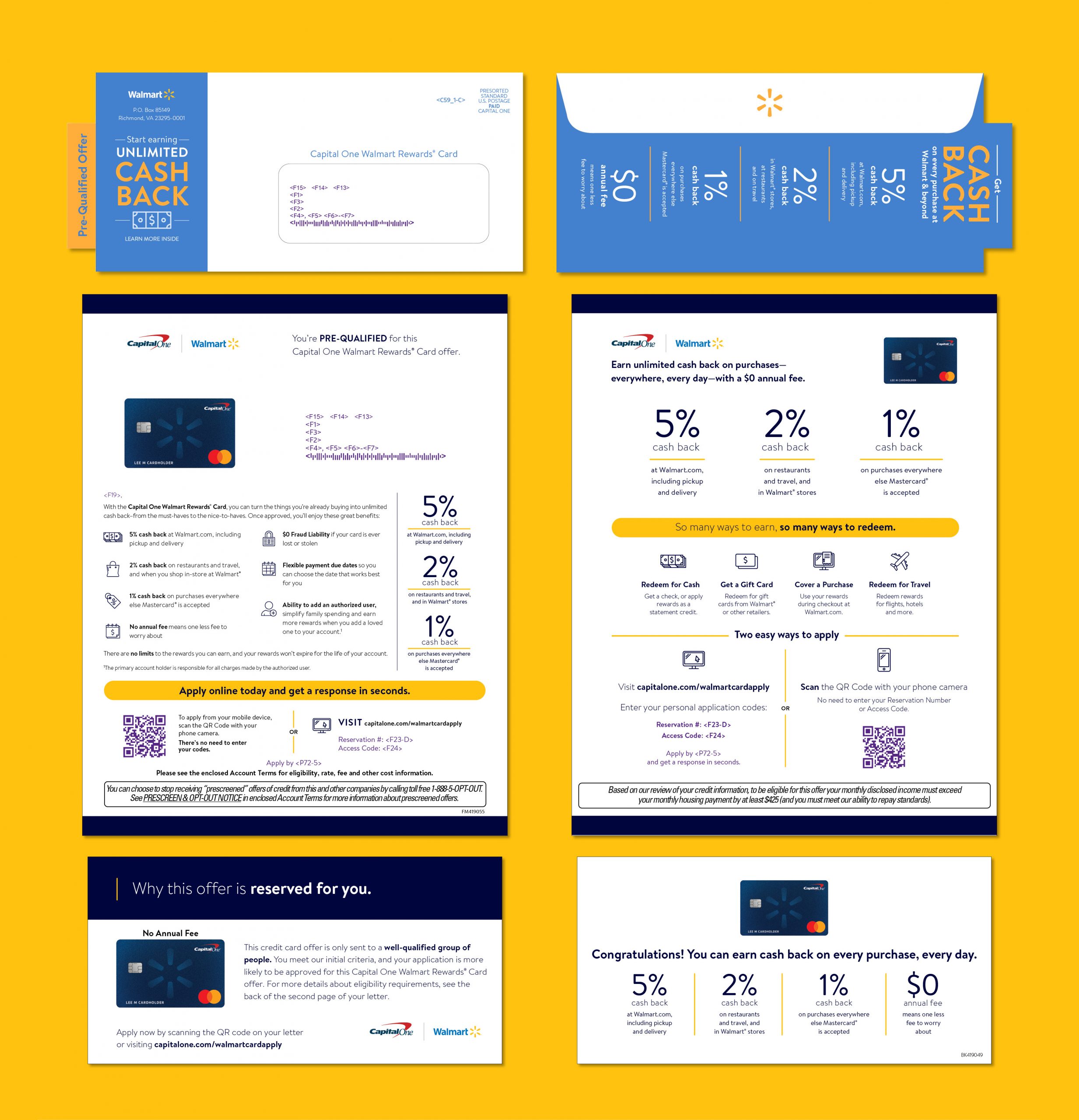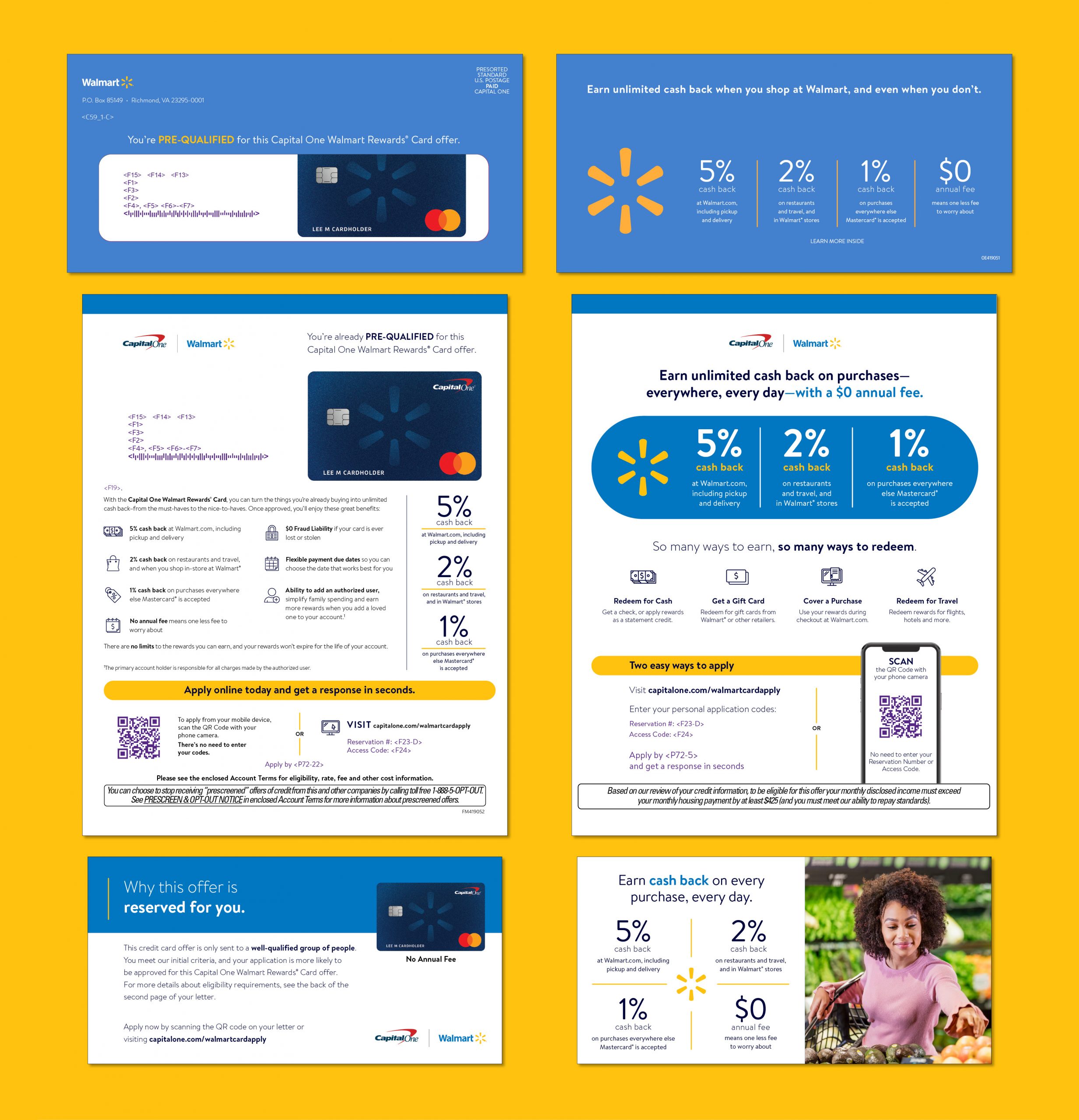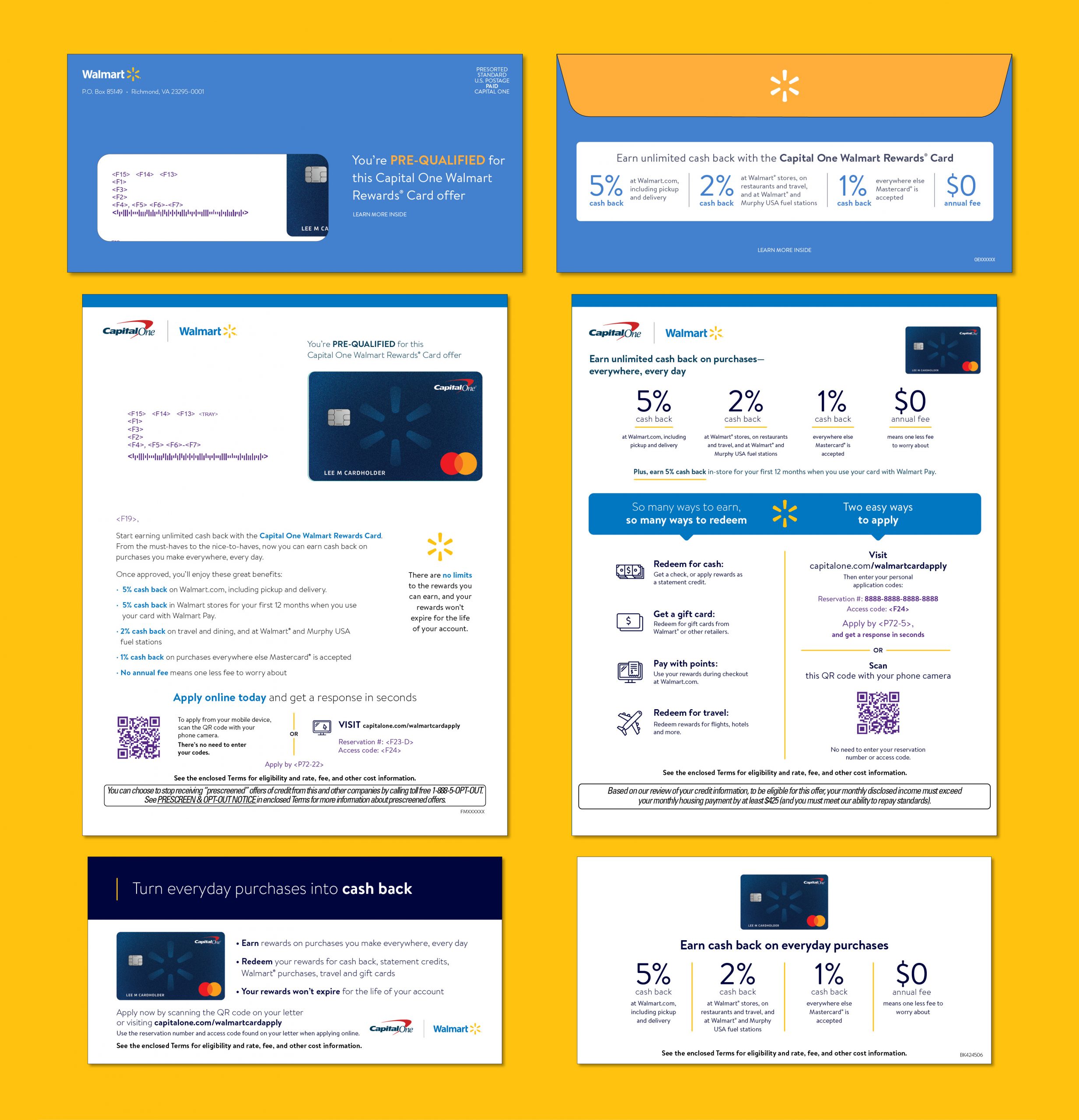 Capital One issues both its own credit cards and co-branded cards with partners such as Walmart and Union Plus. For these campaigns, I designed multiple direct mail kits—including letters, buck slips, and envelopes—within a templated “family” system where formats, window placements, and dimensions were fixed.