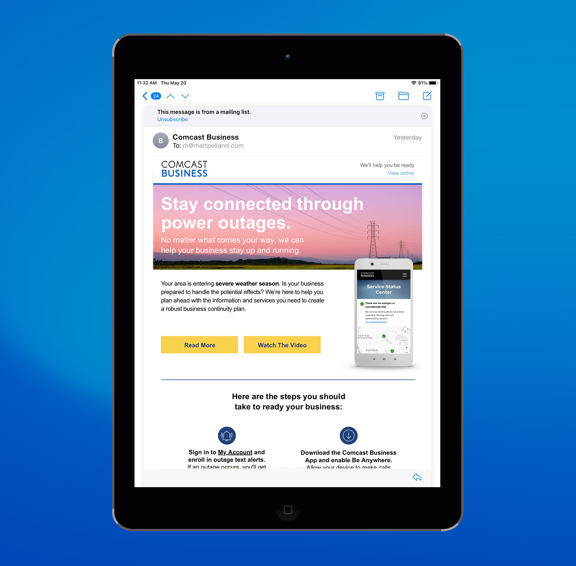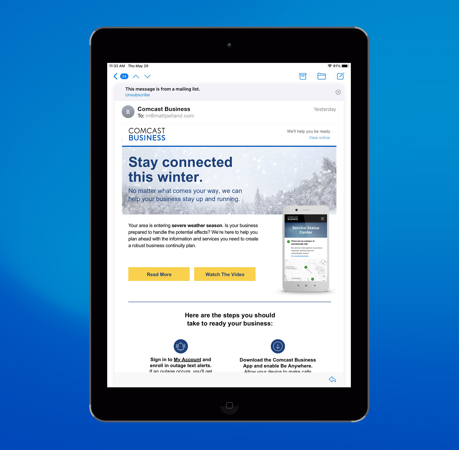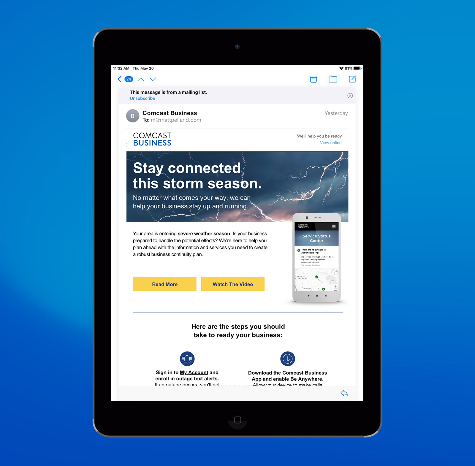 Created a series of personalized email alerts for Comcast Business customers, warning of inclement weather or environmental risks based on location and timing, powered by Moveable Ink. To support Comcast’s expansion into mobile services, I also developed logo exploration concepts for the Comcast Business Mobile brand.